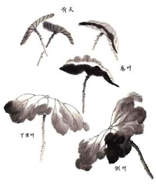 荷尖和卷叶:荷尖可用侧锋一笔画出。卷叶用浓、淡墨色画出。再用浓墨勾叶脉。