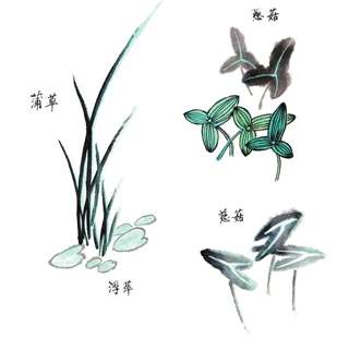 一幅画要显得生动,除了主体物的描绘以外,还要搭配上各种动植物。荷花的配景以水生植物为主,如鱼、水鸟、水草等。配景不可过多过大,颜色不可过艳,免得喧宾夺主。
