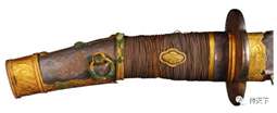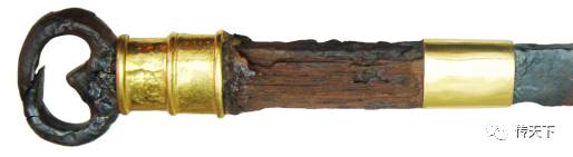 图七(此刀的刀镡与青铜剑格造型很相近,说明这时的刀装还没有完全摆脱早期剑装的影响,刀镡与鞘结合呈“V”字形边缘设计,可以增加刀身与鞘之间的紧密度,使刀身入鞘后不容易上下摇晃,但这样的结构也增加了制作的难度,后世的刀镡、剑格在设计时,基本将刀镡与鞘结合的“V”字形结构取消,变为两者直线平行结合,以此简化工序)