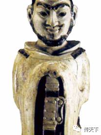 (图三)及湖北鄂州市鄂钢综合原厂一号墓出土的三国时期环首刀实物(图四),均未见刀镡的痕迹,这种情况在唐代的环首刀上仍然存在,如陕西长安县出土的环首刀(图五),亦没有刀镡,这种刀在入鞘时因为没有刀镡阻挡,刀将柄前段可以一并插入鞘中,如:1959年河南安阳隋开皇十五年张盛墓出土的持刀瓷俑,其刀柄前段即是没在刀鞘之中(图六)。