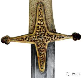 元代由蒙古人建立,厚重直刃的宋刀并不适合马上作战使用,包括宋刀在内的大量宋式武器被元朝统治者下令销毁,而随着蒙元帝国的西征,轻便锋利的西亚弯刀引起了元军的注意,并逐渐受到这个马背民族的青睐,元军开始大量制作和装备弯刀。这一时期的刀镡外形除中原地区常见的桃形和南瓜蒂形外,还出现了一种在西亚地区流行的“十”字形刀格, 如:1956年山东济宁市梁山县贾庄村西宋金河支流出土的明初沉船中发现的弯刀,很可能就是降明的元军使用的武器,其刀格为“十”字形(图十四)。这种形制的刀格并未随元朝的灭亡而消失,在明代仍然沿用,如:1958年明定陵出土的万历皇帝佩刀就是“十”字形刀格。元明时期制作的“十”字形刀格往往做工精美,如:中国人民革命军事博物馆所藏的一只明代弯刀上“十”字形刀格就采用了铁地镂空錽金的工艺,异常华美(图十五)。