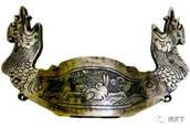 同时,这时期刀镡、剑格还采用一种錽金银的工艺装饰刀剑,如:兵器收藏家皇甫江先生收藏的隋刀刀镡即是采用此种工艺进行装饰(图三十一)。錽金银工艺是以铁为地进行的金银修饰工艺。首先,在铁的表面用锉刀或平头錾子锉出或剁出细密如布纹的网格纹,将金银丝或金银片按图样敷在器物表面,用平头锤将金银挤压到之前制好的网格凹纹内,然后用火烤加温器物,再用砑石挤压,使金银与铁底紧密结合。在錽好的金银片表面錾刻花纹,修整图案,将图案外多余的錽金银部分剔除,在金银以外的部分涂上大漆,以凸现金银图案的光彩。錽金银工艺不同于错金银工艺,错金银要在坚硬的铜、铁等金属器物的表面开槽用于嵌入金银,需要耗费大量的人工,为了降低成本,铁错金银技术逐渐为铁錽金银技术所替代。