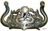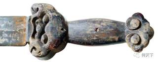 西汉时期,刀取代剑成为战场主角后,剑的实战功能逐渐被礼仪功能取代,因此,后世的剑素有“百兵之君”的美称,剑格造型也由此摆脱了功能的约束,变得越来越丰富,甚至夸张起来。如:起源于春秋战国之际的贵族佩戴之玉具剑,在汉代达到了鼎盛,这种玉质剑格除了彰显身份地位,毫无实战可言。即使是铜质剑格,一些剑格的夸张程度也很难让人相信其造型是出于实用功能考虑而进行的设计,如徐州博物馆藏的一只汉铁剑上的人面龙纹铜质剑格(图十六-1),两侧镂空的龙纹在实战中能否保证牢固值得怀疑。不过,这种抛弃功能,只注意外观的设计理念对后世刀剑装饰影响很大,明清时期的剑格也有类似的夸张造型,如:沈阳故宫所藏的清太祖努尔哈赤佩剑(图十六-2)及广州张先生收藏的明代双龙抱日剑格(图十六-3)上均能体现这种特征。