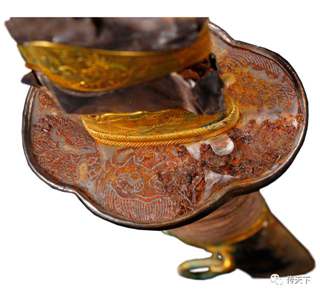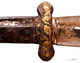 錽金银工艺在宋代开始日渐成熟,元明清时期成为一种广泛使用的工艺,一些高级别的刀剑往往采用錽金银工艺来装饰(图三十二)。如:《明会典》中就有“红鲨鱼皮靶黑斜皮鞘錽银事倭腰刀”的名目等等。一些刀剑还采用整体錽银加局部錽金或鎏金的工艺装饰刀装,使装具外观更具层次感,华丽异常。如:江西藏友所藏明代刀镡即是采用了此工艺加工(图三十三)。今天,铁质刀剑装具是否采用过錽金银工艺已成为刀剑收藏者衡量刀剑级别的重要标准之一。