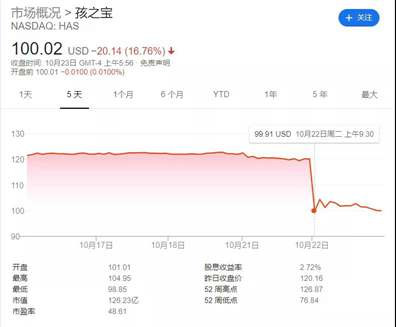 这份糟糕的财报公布后,孩之宝股价从约120美元/股跌倒了约100美元/股,投资人对财报的态度已经写在股价上了。