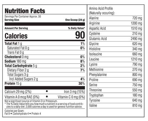 成分:乳清分离蛋白、果糖、阿拉伯胶、天然香料、磷酸二钾、磷酸三钙、酸樱桃果粉、盐、黄原胶、氧化镁、豌豆纤维、甜菜纤维、纤维素胶, 甜菊糖甙 A, 抗坏血酸, 富马酸亚铁, 烟酰胺, d-α-生育酚乙酸酯, 维生素 A 棕榈酸酯, 氧化锌, 葡萄糖酸铜, 泛酸钙, 胆钙化醇, 多烟酸铬, 柠檬酸锰, 吡哆醇盐酸盐, 硫胺素(维生素B1),碘化物,生物素,钴胺素(维生素B12),叶酸,亚硒酸钠。含有牛奶和大豆。
