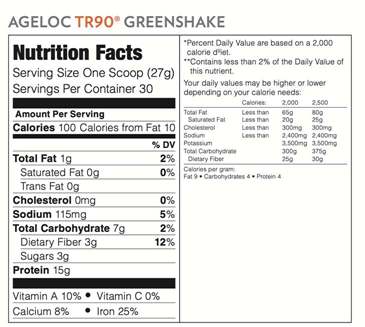 成分:蛋白质混合物(豌豆蛋白、大米蛋白、奇亚籽粉)、结晶果糖、绿色混合物(小麦草汁粉、苜蓿汁粉、螺旋藻、小球藻、甜菜粉、菠菜、大麦草)、阿拉伯胶、天然香料、酸樱桃果粉、黄原胶、甜菊提取物(莱鲍迪苷 A),不含麸质。