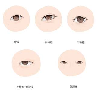 常见的非标准眼型大概有这么几种:短眼,吊稍眼,下垂眼,单眼皮+肿泡眼,眼距过宽。