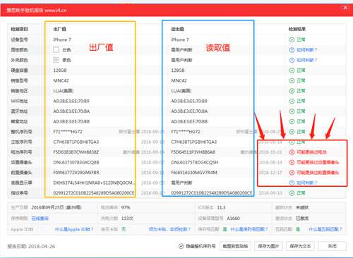 3.3. 爱思助手,通过软件,将主板里面的ID码读取出来,与手机里实际的零件ID码进行对比,若是一致,说明这些零件没有被换过,若是不一致,若是换了零件,手机维修过;